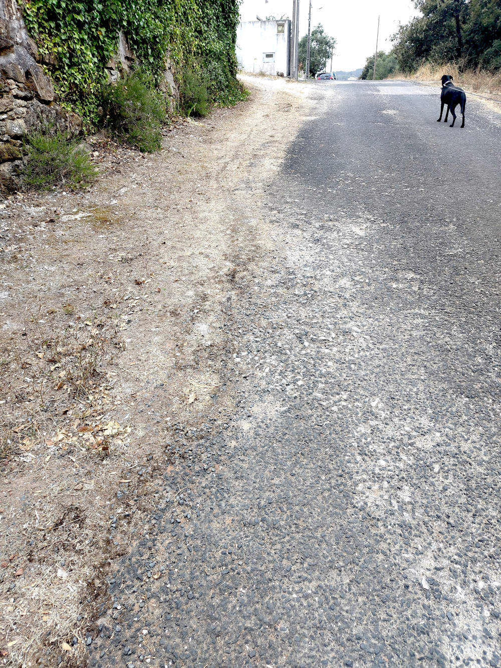 Dat mieren goed georganiseerd zijn wisten we al. Waarschijnlijk zit er onder het geitenveld een mierennest van enkele kubieke meters en wie weet hoe diep. Langs het weggetje, voor het huis van António en Manuela is een grasstrook met daaronder ook een mierennest. Vanuit dit nest loopt er een enorm lang spoor. Het eerste stukje door het gras. Je moet goed op de foto kijken wil je het zien. Het loopt door over het asfalt onder in beeld en verder naar achter. Het spoor is dan niet meer te zien maar als je dicht erop kijkt zie je druk verkeer van slepende mieren. Tot het spoor ergens aan de overkant in de berm verdwijnt. Hier is vast de lokale vindplek van allerlei mierenlekkers. Het hele spoor, voor zover zichtbaar, is zeker vijf en twintig meter lang.