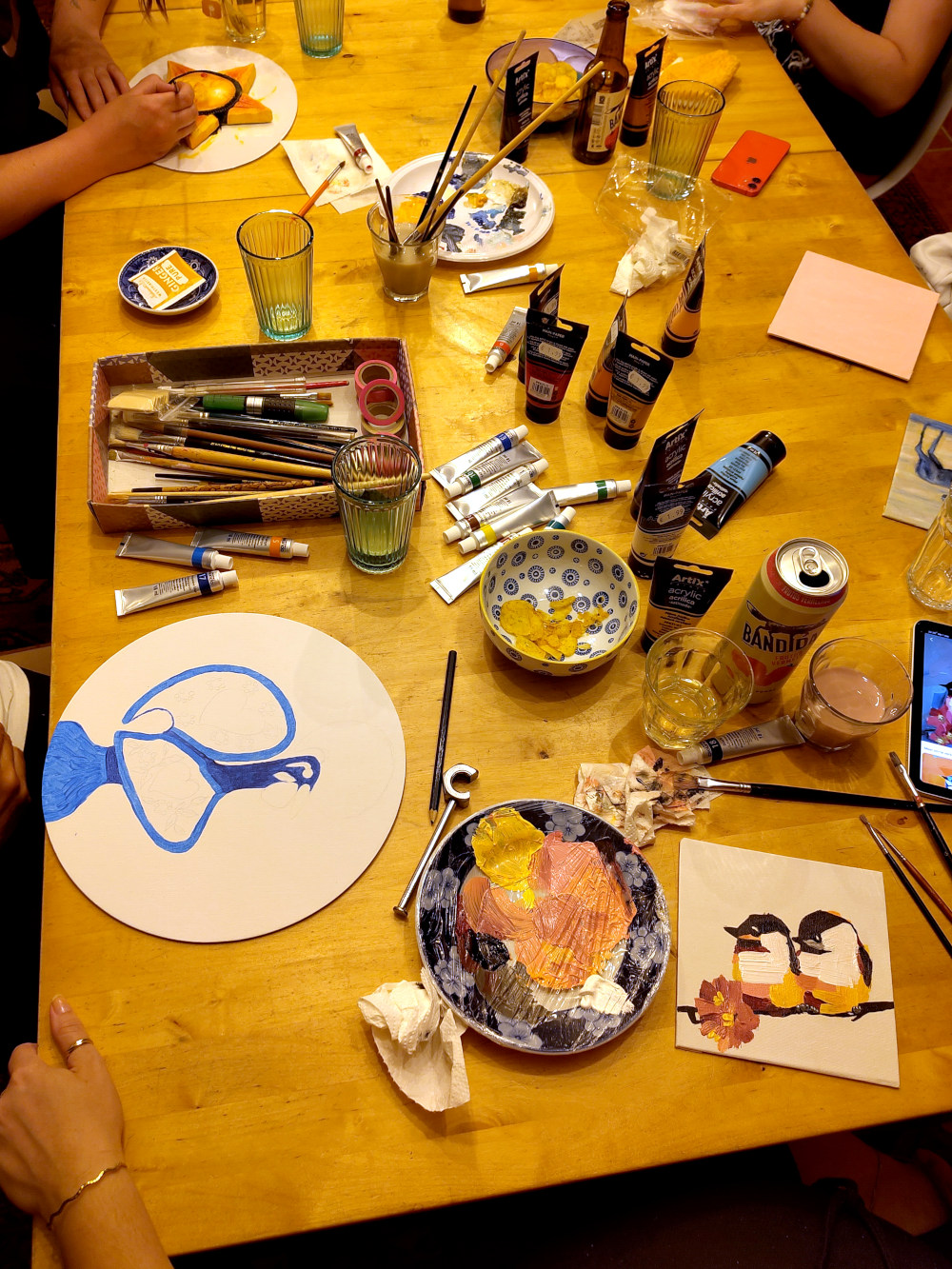 Woensdagavond, knutselavond. Met zijn vijven rond de knutseltafel. Wat een verzamelde creativiteit. Er wordt geschilderd en geverfd dat het een lieve lust is. Buiten gewoon gezellig en een prachtige productie. Jammer dat veel van het geproduceerde weer naar Nederland gaat, maar gelukkig blijft er ook wat achter. We hebben vogeltjes, de Portugese haan, een poes, een paard. Zowaar een halve dierentuin. En dan ook nog een halve maan en een zon. Alles met een drankje en een muziekje.