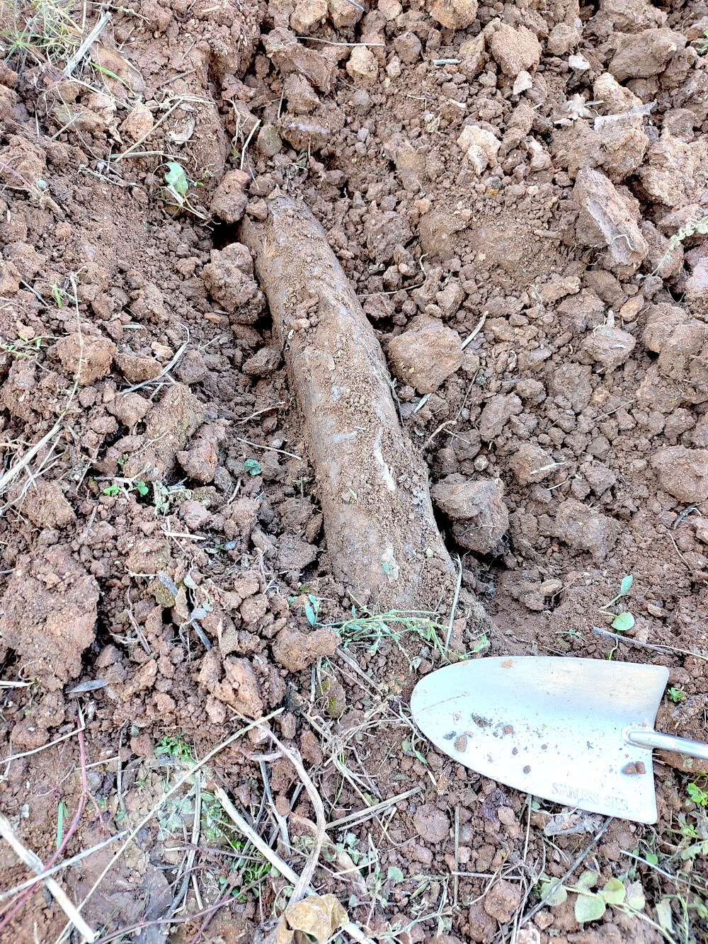 Uiteindelijk bleek het een wortel te zijn. Een flinke uitloper van waarschijnlijk de notenboom, die een paar meter verder staat.