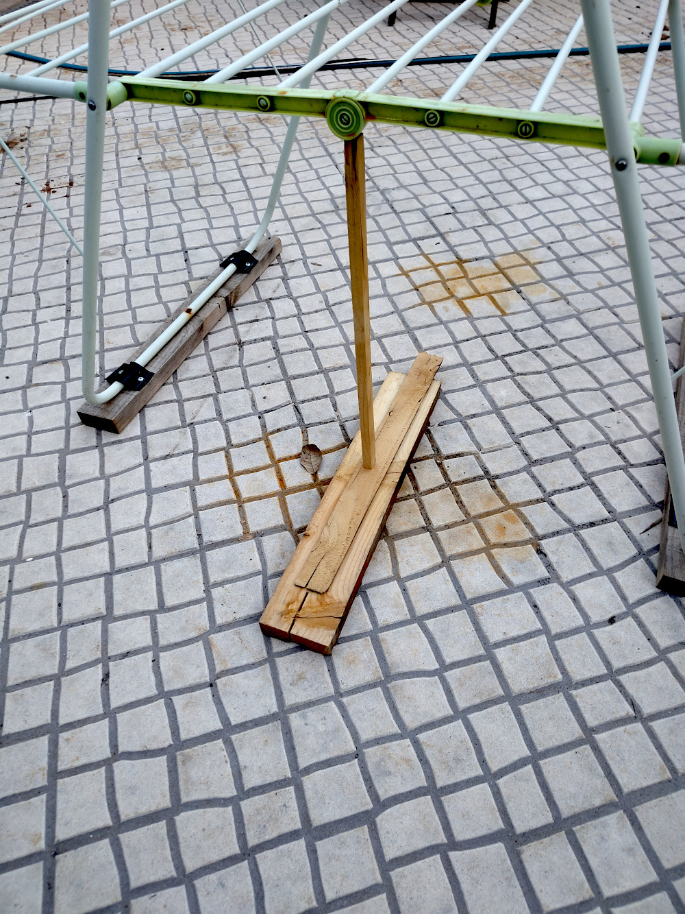 Wat doe je als je een wasrek hebt dat gebroken is, maar verder prima werkt én je hebt geen ander wasrek nog. Je zet er een steuntje onder. Het is fragiel en je moet niet te veel met het rek bewegen want dan stort het steuntje in elkaar, maar het werkt wel. Er is zoveel restmateriaal aan hout dat er altijd wel iets te vinden is dat precies op maat is te maken. Zo kan het weer een tijdje mee.