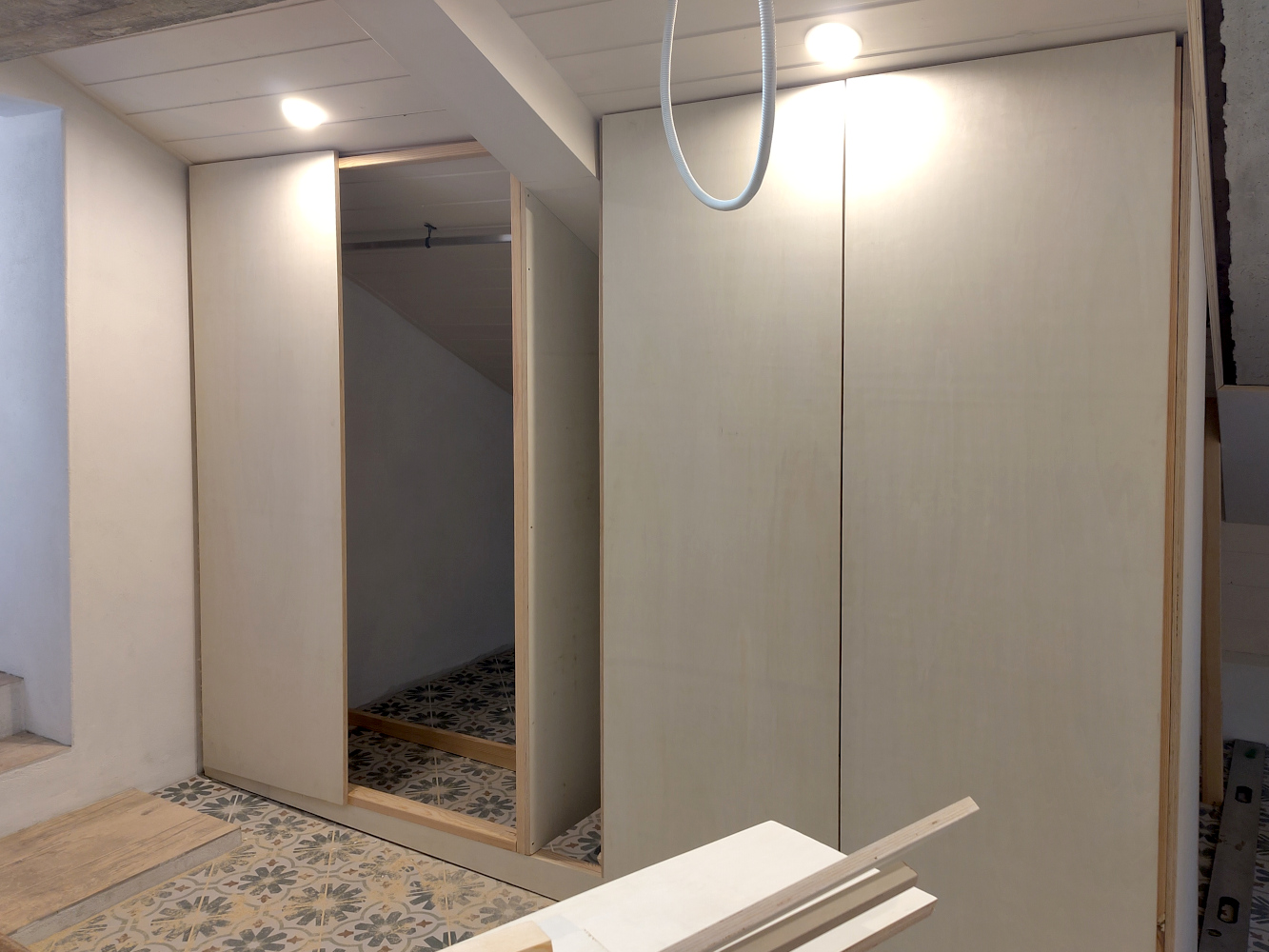 We willen eerst zien hoe het uitpakt qua ruimtebeslag en zo en welke ruimte je aan de binnenkant hebt. Als we dat weten gaan we fase 2 doen, dan wordt de indeling gemaakt, waar precies planken komen waar er grote ruimtes zijn en waar we de spullen op gaan bergen. We hebben er wel lekker veel bergruimte bij. Kunnen mooi de spullen die her en der staan opgeslagen prima opgeruimd worden.