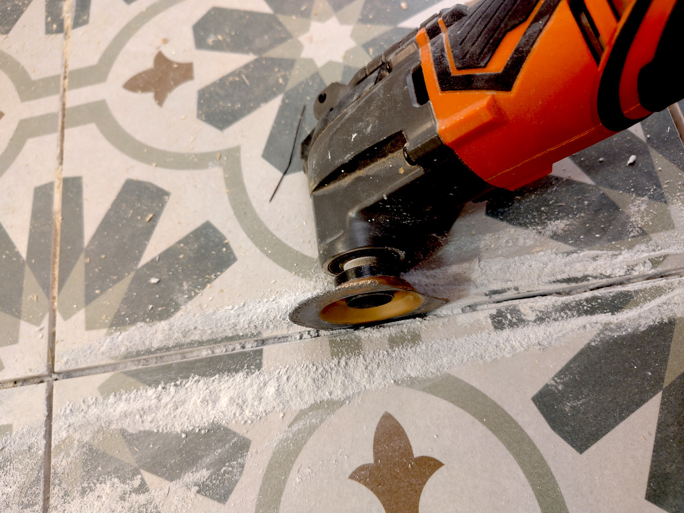 Met een haakse slijper weghalen werkt niet want voor je het weet neem je de halve tegel mee. De uitkomst is de multi-tool, met een schijfje dat keiharde diamanten puntjes heeft. ’t Schijfje draait niet maar maakt kleine ronddraaiende beweging. Ideaal voor het schoonmaken van de voegen, maar bewerkelijk is het wel.