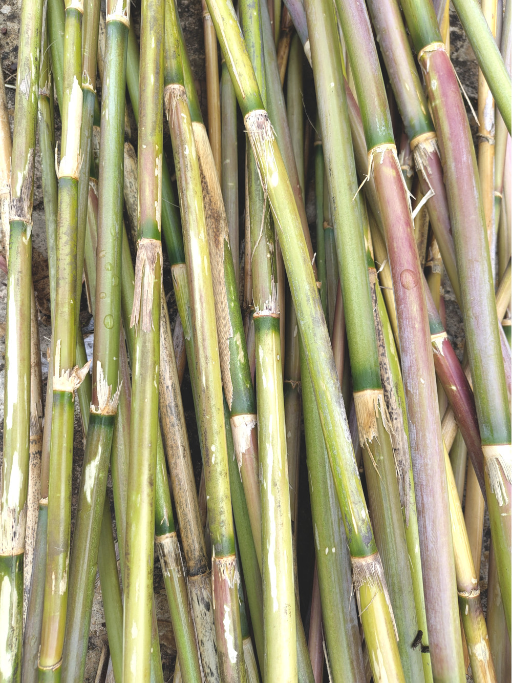 Hadden Amber en Lisa al een flink aantal takken uit het bos gehaald. Maya, onze vrijwilligster, heeft er nog een schepje bovenop gedaan, We hebben nu een flinke bos bamboe voor de deur. Er is nog veel groen, het moet allemaal nog drogen, maar dan hebben we voorlopig genoeg om allerlei steuntjes voor de planten te maken. Dat drogen gaat best wel snel. De takken liggen op het pleintje op de stenen in de volle zon. Met een weekje moet het toch wel klaar zijn.