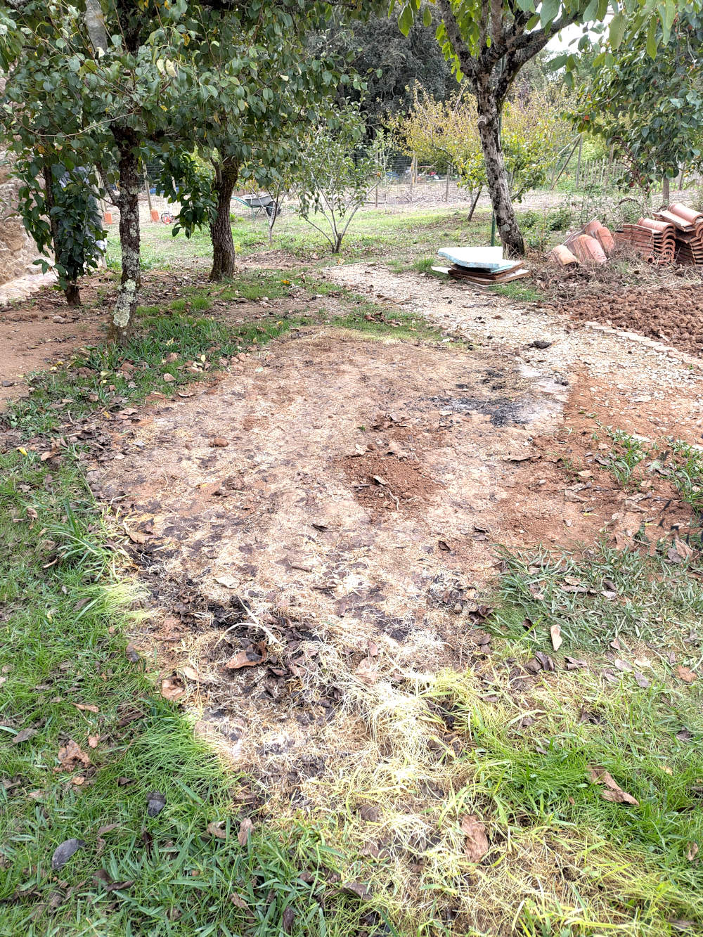 Een paar weken geleden heeft Leo de fundering voor het Oude Huis gemaakt. Daarvoor moest er flink gegraven worden en dat levert een berg aarde met stenen op. Die aarde is niet helemaal teruggegaan, want waar fundering zit kan geen aarde zitten. Die berg heeft er een tijdje gelegen. Gelukkig wel op een zeil, hierdoor is het weer redelijk makker weg te scheppen. De berg is geschept naar een plek waar te weinig is. Achterblijft een stuk zeil dat aan alle kanten begint te vergaan en rijp voor de vuilnisbak is. Onder het zeil is een grote plek, helemaal kaal. Er zit nog wel wat gras onder, maar dat is bij gebrek aan licht helemaal wit geworden. ’t Trekt wel weer bij hoor. Als er straks weer regen gaat vallen dan is het zo weer groen.