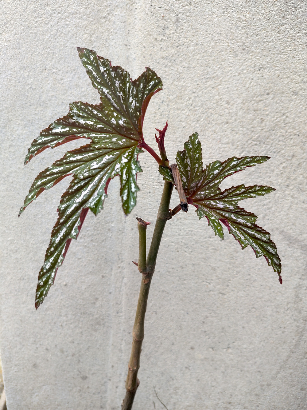 ’t Zag er nogal als een zielig plantje uit. Eigenlijk een bijna-doodplantje. Het was één staak met verder niets. Maar water geven, warme zon en aandacht helpt. Eerst voorzichtig een paar puntjes aan de stam en nu een paar dagen later twee prachtige bladen en de plant lijkt prima in orde en helemaal gezond.