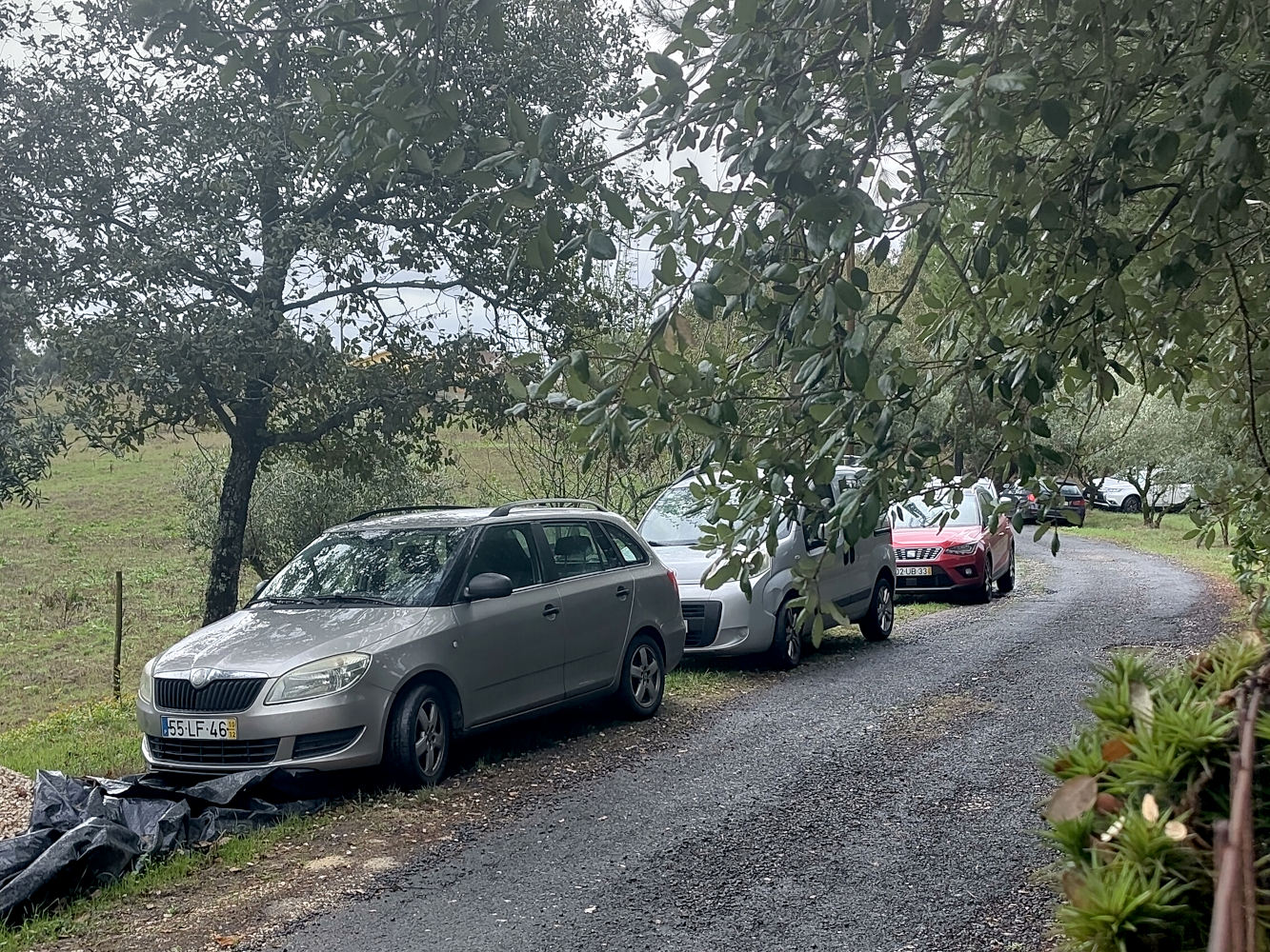 En ineens is het erg druk op het weggetje. Wel vijftien auto’s zijn losjes geparkeerd in de berm en zelfs iets verder de berm in. Aan het begin staat een bus, die durfde het weggetje niet op waarschijnlijk. Geen mens te zien, alle auto’s zijn leeg en bestuurders en passagiers zijn nergens te bekennen. Waar zouden ze toch op afgekomen zijn?