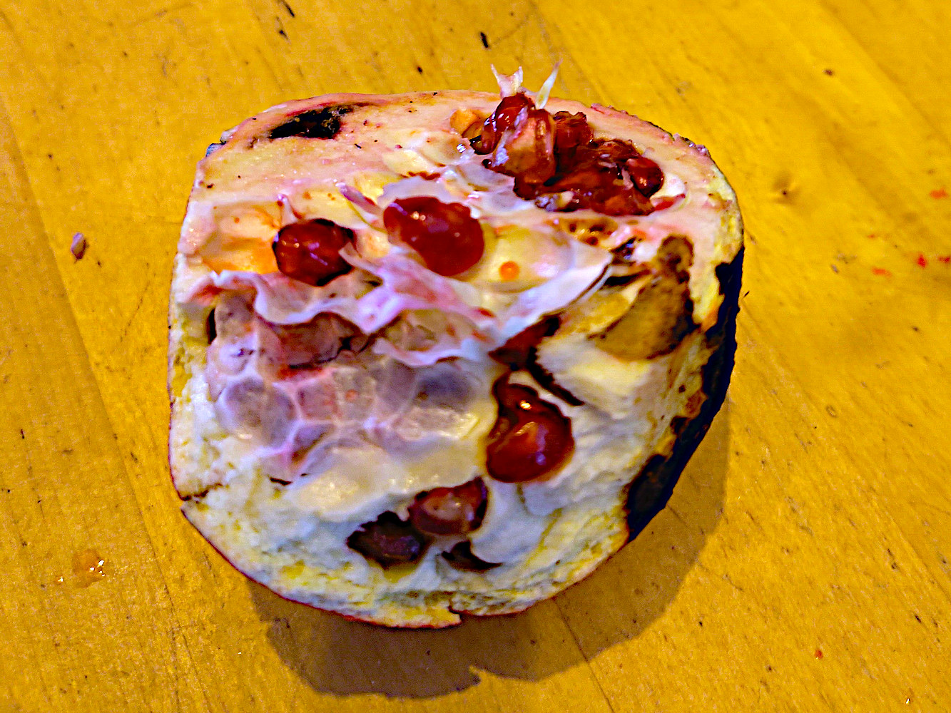Als de vrucht op de grond ligt en opengebarsten is, gaan sommige al spruiten. Op de foto zie je er een paar bovenin.