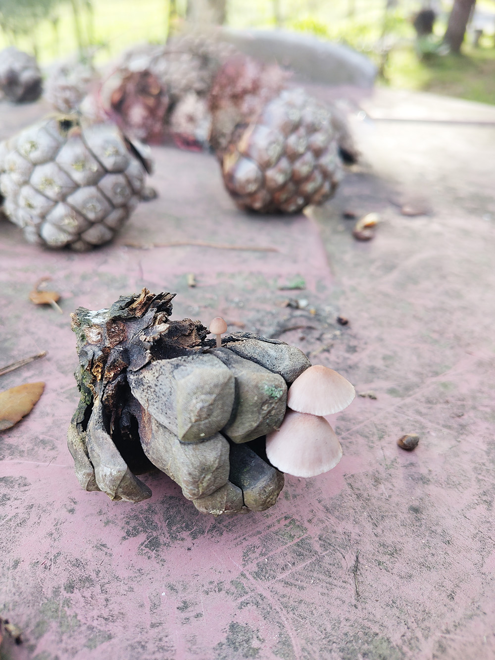De herfst heeft aan alle kanten toegeslagen in Portugal. Alles is nat en vochtig na een dag van heel veel regen en een paar dagen met wat minder regen. Overal zie je ineens paddenstoelen en, grappig, op onverwachte plekken. Op de tafel liggen nog een paar dennenappels en op één van die vinden we ook zomaar een paar paddenstoeltjes.
