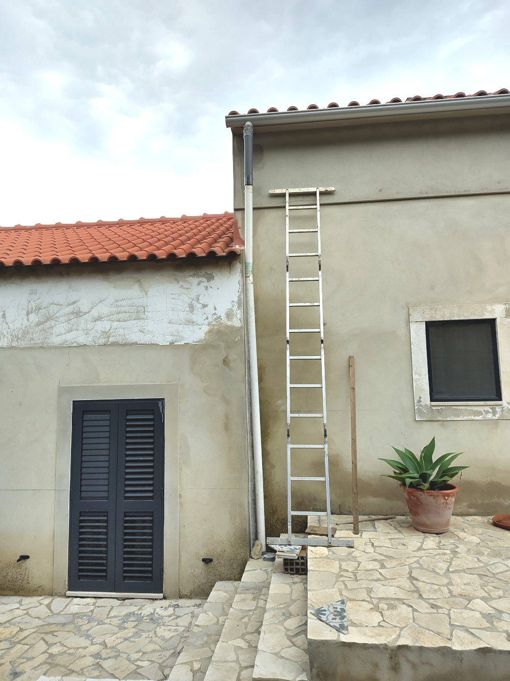 De regenpijp moest even weg om de scheur te kunnen repareren die was ontstaan waar het appartement en het middenhuis aan elkaar zitten. Het is nog steeds improvisatie. Het zijn stukken regenpijp aan elkaar gemaakt met plastic flessen die met een schildersföhn klem gebrand zijn. Hopelijk blijft het even zitten. Een grote storm zal het het niet overleven, maar het hemelwater wordt voorlopig afgevoerd in plaats van dat het uit elkaar spat op het terras.