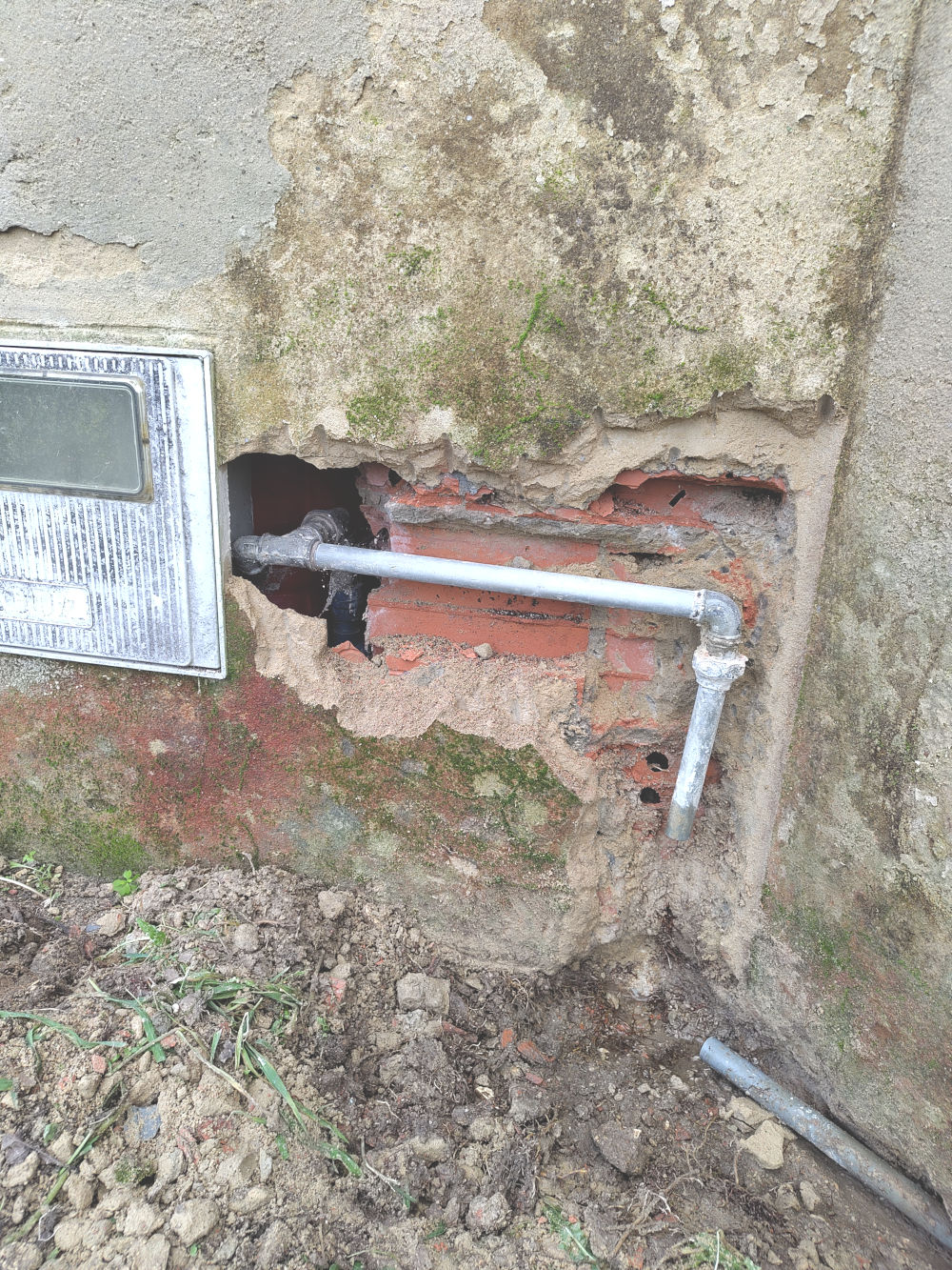 Het lek is boven, dat wil zeggen gevonden. We dachten dat het in de grond zat, Leo heeft eerst gegraven, maar in de grond zit helemaal geen leiding. We hoopten stiekem, een beetje tegen beter weten in, dat er waterleiding van de gemeente zou liggen wat het aansluiten erg makkelijk zou zijn, mocht de nood aan de man zijn. Maar nee, niets daarvan. Het lek zat niet in de grond maar in de muur. Leo heeft een flink gat moeten hakken om het te vinden. Het bleek een knietje te zijn. Ooit aan elkaar gezet met schroefdraad en hennepdraad, maar het hennepdraad is vergaan en daardoor lekt het. Dat wordt vervangen dus.