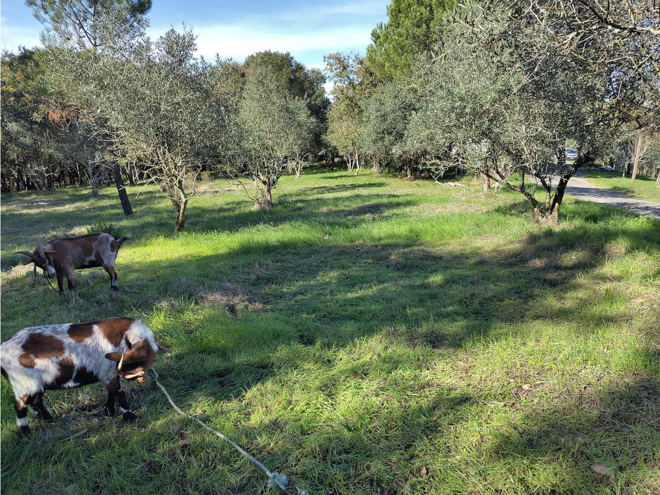 Het gras begint alweer aardig te groeien. Tijd om de geiten weer aan het werk te zetten. ’t Mooiste gras staat tussen de olijfbomen en daar moeten de geiten juist vanaf blijven. Het blad zouden ze wel mogen eten, maar ze knagen de bast van de stam en dat is niet zo goed voor de boom. Tussen de olijfbomen staan ze daarom aan een relatief kort touw. ’t Mooie is dat ze dan prachtige cirkes in het gras vreten. Op de foto niet zo goed te zien, maar als je nauwkeurig kijkt zie je vooraan een cirkel in het gras en iets verderop ook weer één. Nu staan de geiten er een beetje naast opdat ze een overlappende cirkel kunnen maken.