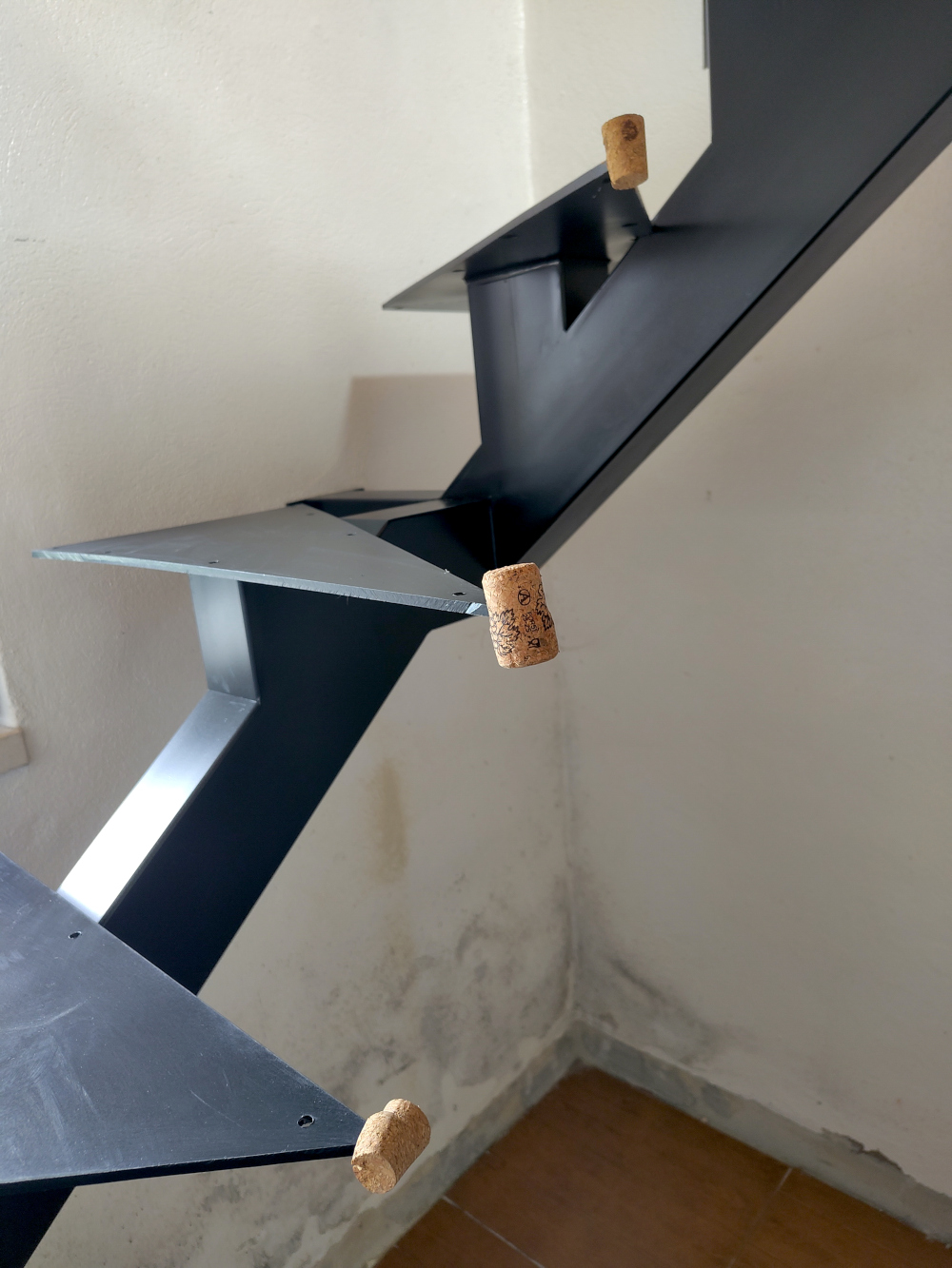 De trap is geïnstalleerd. Een verademing om gewoon binnendoor naar boven te kunnen lopen. De houten treden moeten er nog op. De metalen ondersteuning is er al wel en je kunt er gewoon op staan. Het nadeel is dat de hoeken aan de binnenkant nogal scherp zijn. En hard. Als je eronder bukt en je komt overeind tegen zo’n punt aan dan heb je gegarandeerd een gat in je hoofd. dat willen we graag voor zijn en daarom hebben we op de punten een kurk geprikt. ’t Ziet er grappig uit, maar het is bovenal zeer effectief.