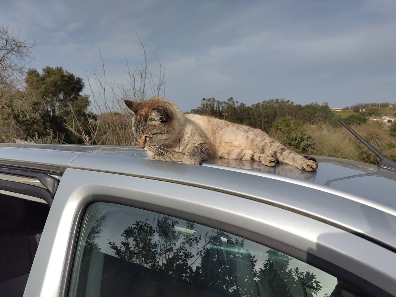 De bus staat nauwelijks in de zon of Gaia heeft alweer een rustplek op het dak gevonden. Lekker warm, ze kan het gedoe een beetje aankijken in alle rust uit de hoogte. Slimme beesten die katten.