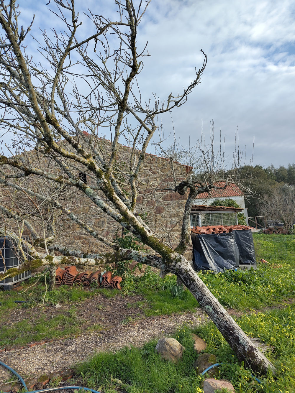 Zoals gezegd heeft het flink gestormd in Portugal. Veel huizen hebben schade. Bij vrienden van ons zijn er dakpannen van het gewaaid en met die regen geeft dat lekkage problemen. De regen is wel weer opgehouden, maar de schade blijft. Bij ons is de notenboom omgegaan. Bij een eerdere storm vorig jaar, was hiij al scheef komen te staan. Eigenlijk hing hij een beetje tegen de perenboom en hield nog wel stand. We hebben hem toen gestut in de hoop dat de wortels weer aan zouden slaan en wat stevigheid zouden geven. De laatste serie van stormen was te machtig en hij heeft het niet gehouden. We moeten hem een dezer dagen maar flink inkorten en kijken of er wat overblijft dat weer uit kan lopen. Als dat niet lukt, moet hij maar helemaal weg.