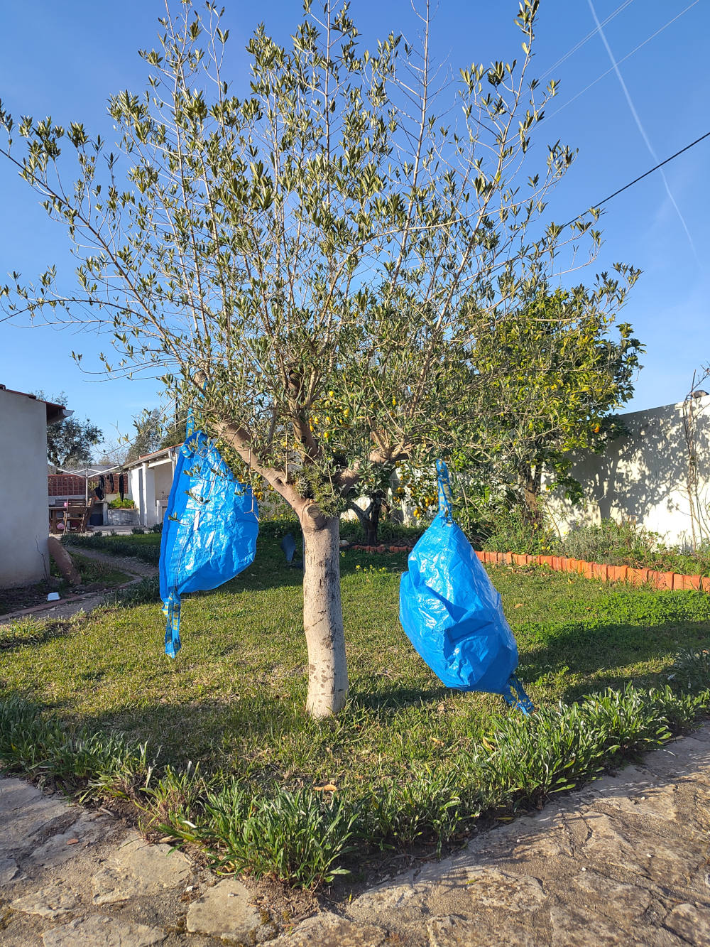 De was kwam ik grote IKEA-zakken en die moeten dan ook gewassen worden. Hangt mooi te drogen in de olijfboom.