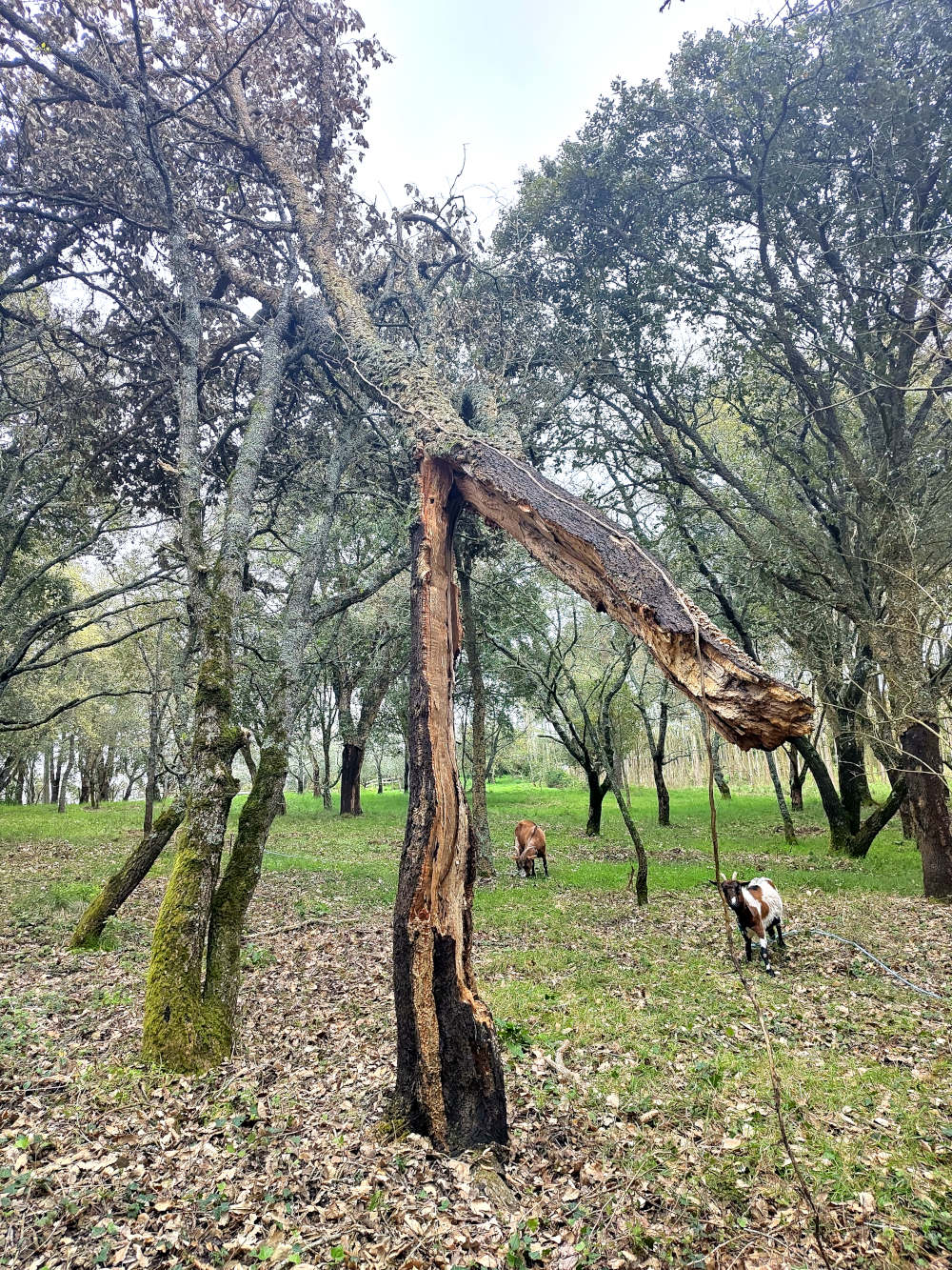 In het bos waar we overdag de geiten vaak neerzetten is ook een enorme kurkeik getroffen door de storm. De eik is in de lengte gespleten en omgevallen en hangt nu in een buurboom. Redelijk ongevaarlijk, hij zal niet snel verder vallen. Maar het is wellicht wel zaak het een beetje op te ruimen. Als was het maar vanwege brandgevaar in de zomer.