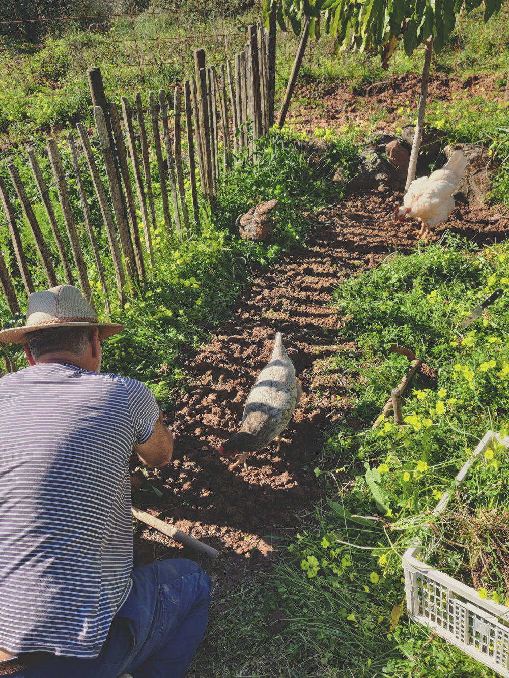 Rond de avocadoboom, die het lekker aan het doen is, groeit allemaal onkruid. Voornamelijk klaverzuring. ’t Idee is dat allemaal weghalen en dan de bodem bedekken met bladeren van de Nespereira. Dat weghalen is nog een heel gedoe. Klaverzuring heeft de overlevingsstrategie van makkelijk afbreken, er blijven altijd stukjes wortel achter als je het gewoon uittrekt. De grond loshalen is dan de remedie. Onder de grond heeft de plant ook allemaal kleine bolletjes die weer moeten uitgroeien tot volledige planten. Die moeten ook weg. Gelukkig vinden de kippen die zaadjes erg lekker. Kwestie van het hok open zetten en de kippen roepen. Die weten dan wat ze te wachten staat, op de plek waar je de grond los aan het maken bent, schieten ze meteen te hulp.