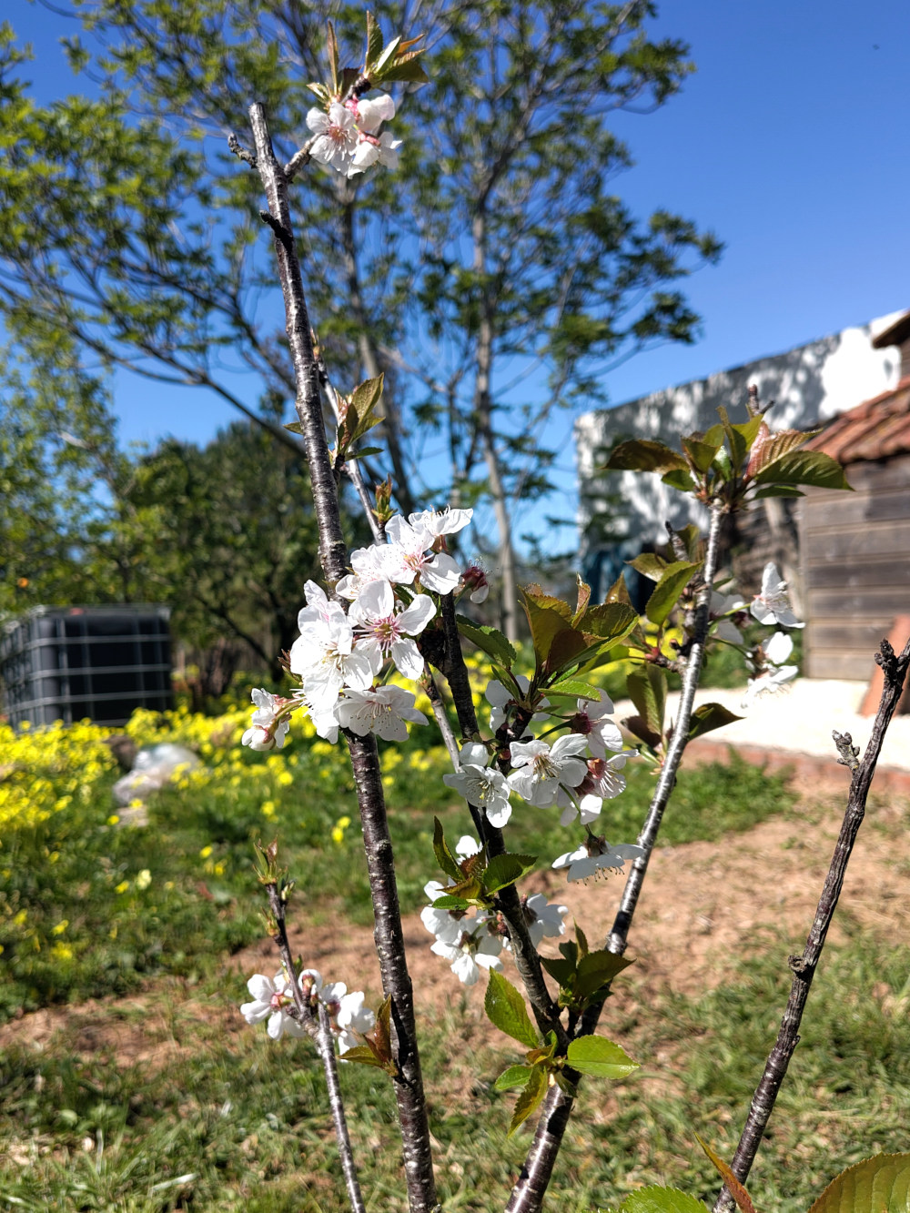 Midden op het grasveldje bij de kippen staat een kersenboompje. Er stonden er eigenlijk vijf, maar twee daarvan hebben het niet gered. De middelste doet het erg goed. Eerdere jaren (hij staat er nu een paar jaar in) hadden we nauwelijks bloemen, maar dit jaar heeft hij de smaak goed te pakken. Op de paar takken die het jonge boompje heeft zit al aardig wat bloesem.