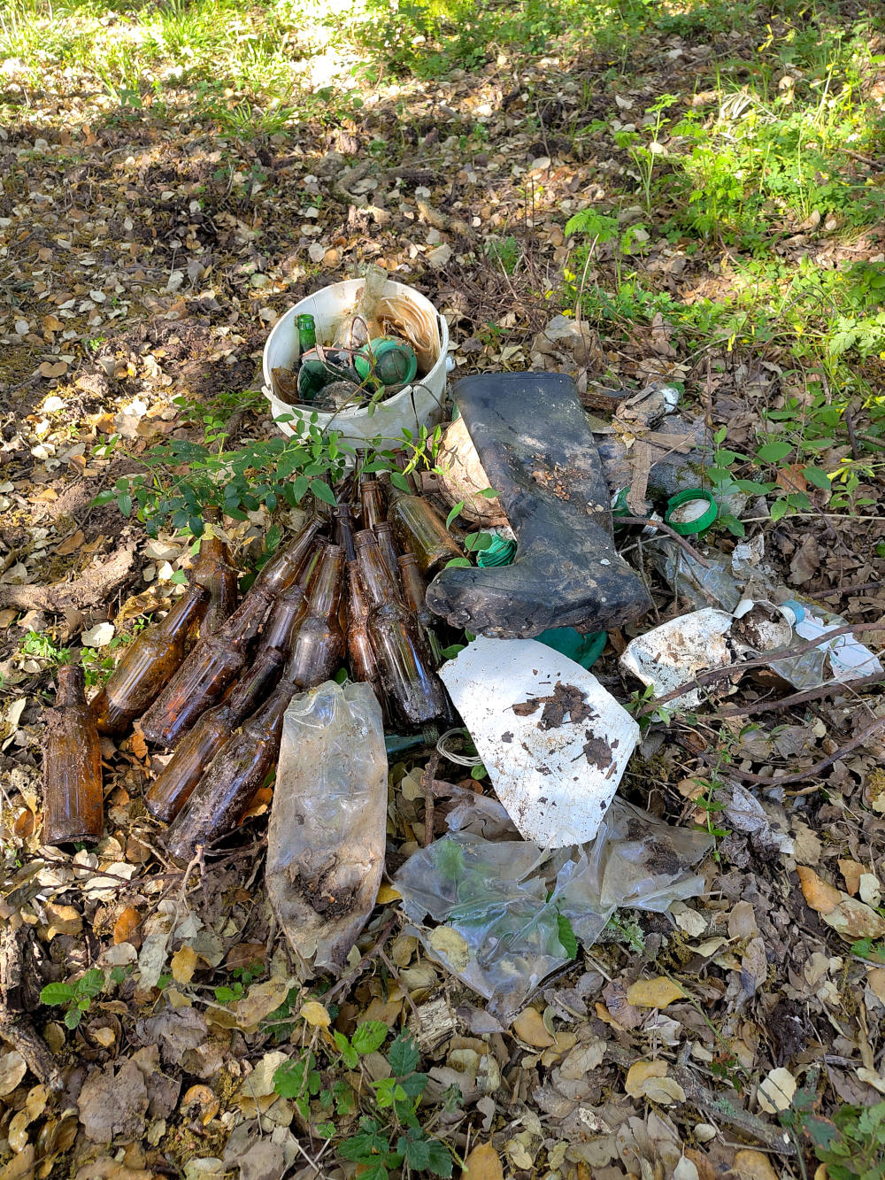 Elke keer als we door het bos achter ons lopen vinden we wel ergens troep. Eerst raapten we dat op en namen het meteen mee om weg te gooien. Soms was dat wel veel en we besloten het eerst maar op één plek te verzamelen. Veel glas, bierflesjes en zo. Ook stukken glas van kapot gegooide flessen. Dat verzamelden we in een emmer. We dachten dat we het meeste wel zo’n beetje gehad hadden, maar nu de varkens van de buren nogal eens ontsnappen en de laatste tijd in redelijk grote groepen vinden we weer veel. De varkens woelen de grond om, op zoek naar wortels van planten of zo. Daarbij halen ze uit wat diepere lagen ook meteen troep naar boven.