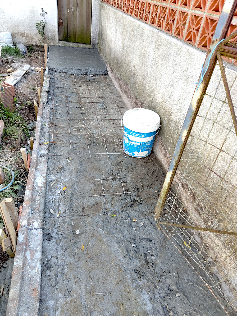 Gisteren was het Goede Vrijdag, ook in Portugal een vrije dag, dus Leo vroeg of hij die dag bij ons kon werken. Gisteren en vandaag heeft hij aan het geitenpad gewerkt, eerst alles wat ook maar een beetje los zat uitgehakt, vervolgens met betonnen balken die we toch nog hadden liggen een rand gemaakt en daarna met cement en kiezels de boel weer opgevuld en gladgestreken. Op de foto nog halverwege, maar intussen is het pad klaar. Het moet alleen nog een nachtje uitharden. Morgen kunnen we erover lopen. Morgen ook een foto van het resultaat.