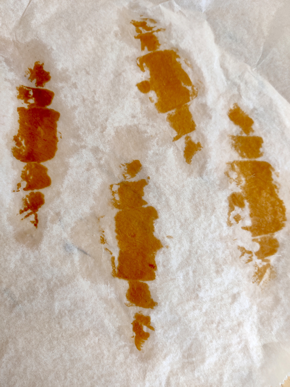 Resultaat: heerlijk warme croissants en mooie afdrukken op het bakpapier. Vers eitje van eigen kippen erbij, vers sinaasappelsap van eigen sinaasappels erbij, en gewoon een rasecht Paasontbijt!