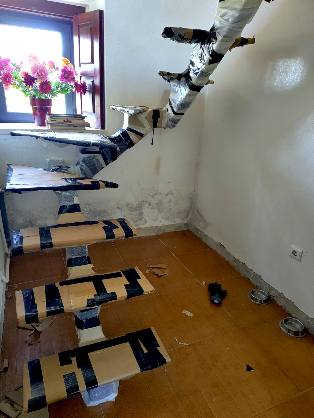 Leo gaat dit weekend het trapgat netjes afstuken. Er is een gat gemaakt in de vloer boven, in het plafond beneden en de rand is tijdelijk gevuld met pur-schuim. Het is nog steeds een zojuist ingehakt gat met lelijke afgebrokkelde cementen vloer en terracotta plafondtegels. Als er met cement gewerkt gaat worden dan is het altijd een kliederboel, ook al werkt Leo bijzonder netjes. Om de net geplaatste trap een beetje te beschermen hebben we hem helemaal ingepakt. Als er dan een klodder cement of gips op valt, dan is het geen probleem. Het is wel een heel gedoe, zo een inpakexercitie. We voelden ons bijna als Christo, de kunstenaar, en eigenlijk ziet het resultaat er best wel kunstzinnig uit. Toch?