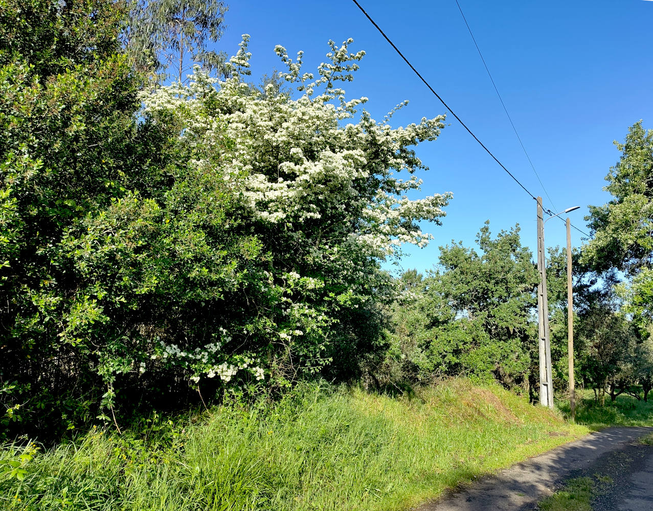 Langs het weggetje staan vooral olijfbomen en eiken. Maar één boom springt er tussenuit, zeker in deze tijd van het jaar. De boom staat vol in bloei. Fantastisch gezicht als die witte bloemen. Vanaf de andere kant is-tie eigenlijk nog mooier, want dan gaat hij niet half schuil achter de andere boom, maar daar staat de zon niet op en dan komt hij wat minder schitterend uit.