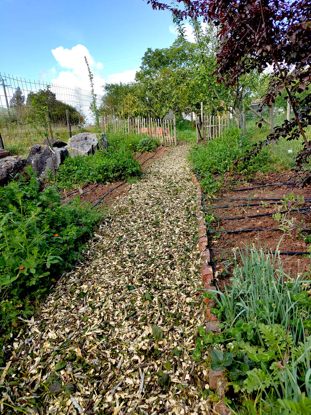 De sneue walnotenboom heeft een tweede leven. Alle takken zijn door Hector, onze versnipperaar, gehaald en het resultaat is op het pad bij de moestuin gelegd. Op die manier hopen we dat het vocht een beetje blijft hangen en, misschien belangrijker, dat het onkruid wat minder toegang heeft tot het pad. Het moet tenslotte beloopbaar blijven. Het is een mooi gezicht, die enorme takkenbos die overblijft na het snoeien te zien veranderen in vier bakken snippers die dan weer een stuk pad van vijftien meter of zo worden. Het ziet er nu allemaal vers uit. De verse houtsneden en de blaadjes die nog aan de takken zaten nog versgroen. Dat gaat wel veranderen de komende tijd.