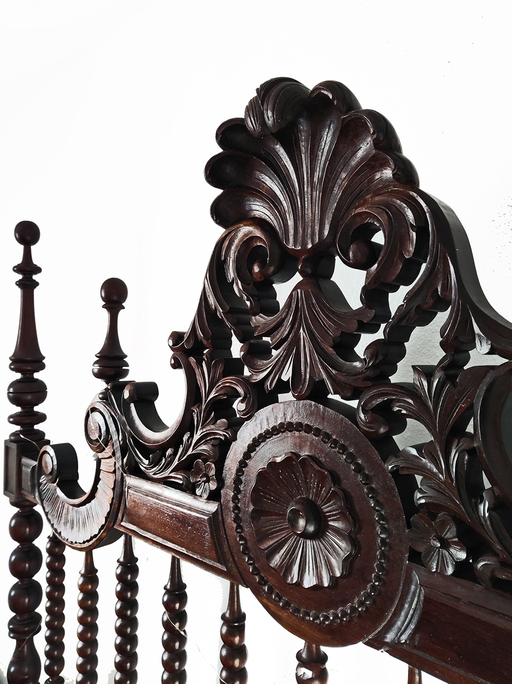 Het donkere hout is nog helemaal niet aangetast, dat hoeft dus niet in antibeestjesspul gezet te worden. Wel in de was en dan werkt dat houtsnijwerk met al zijn kiertjes en krulletjes weer in het nadeel want dat is wel erg arbeidsintensief.