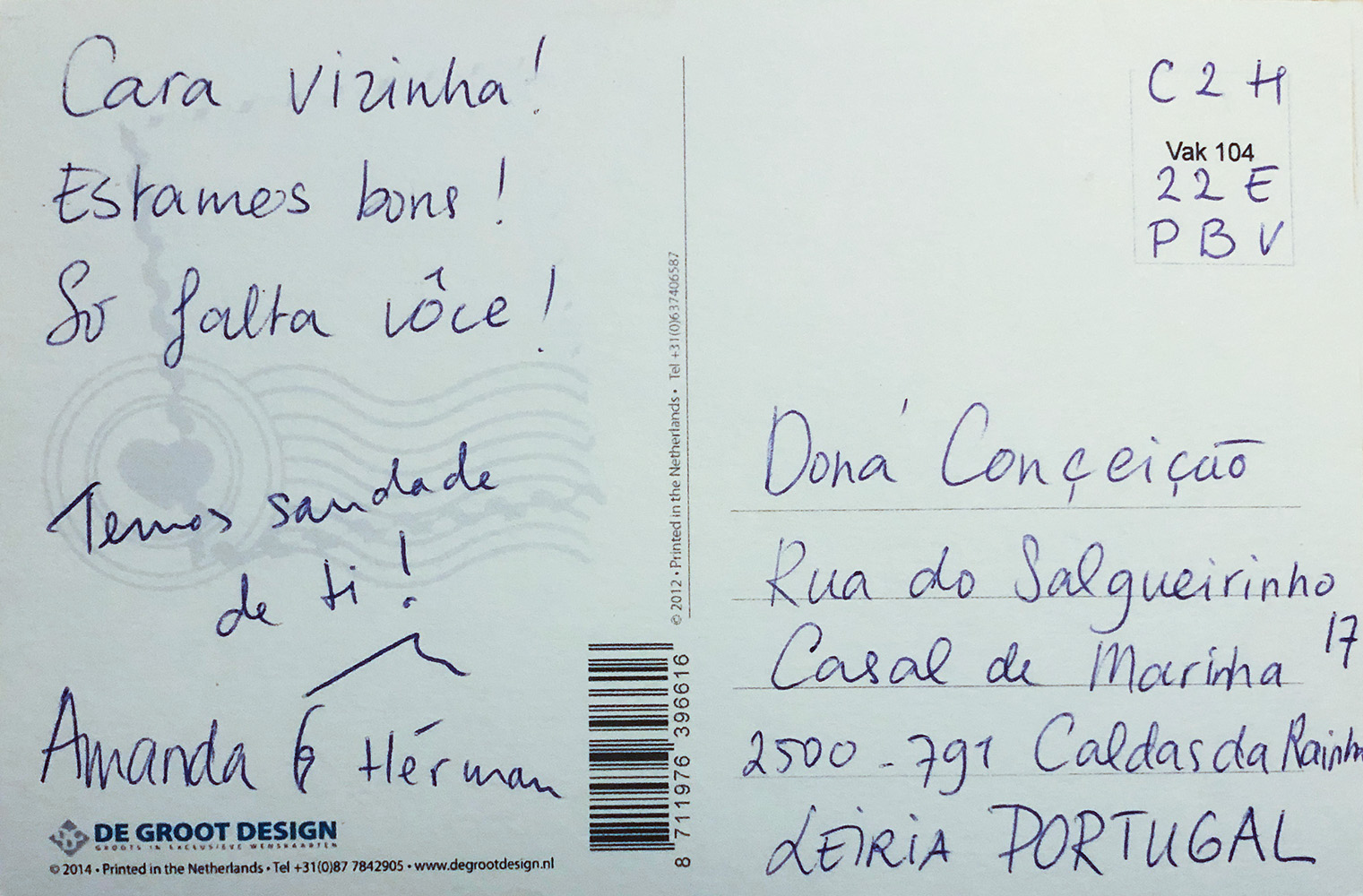 Kennelijk zijn we bekend als die mensen uit Nederland bij het equivalent van Tante Pos in Portugal. Uit Nederland stuurden we een kaartje aan Conceição, onze buurvrouw van beneden het weggetje. Eigenlijk weten we niet precies hoe ze heet. Of Conceição nou haar voornaam is of haar achternaam. Vandaar dat we adresseerden aan Dona Conceição, dona is zoiets als ‘mevrouw” .