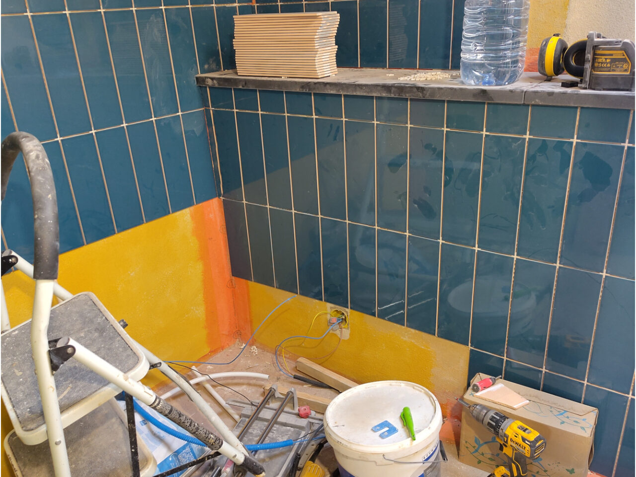 De foto is eigenlijk bedoeld om te weten waar de lasdoos zit. De tegels worden eroverheen gezet, die zien we straks niet meer en mocht het ooit nodig zijn dan is het handig te weten waar het zit. Het geeft ook wel een aardig idee hoe de badkamer eruit komt te zien. Het tegelwerk is […]