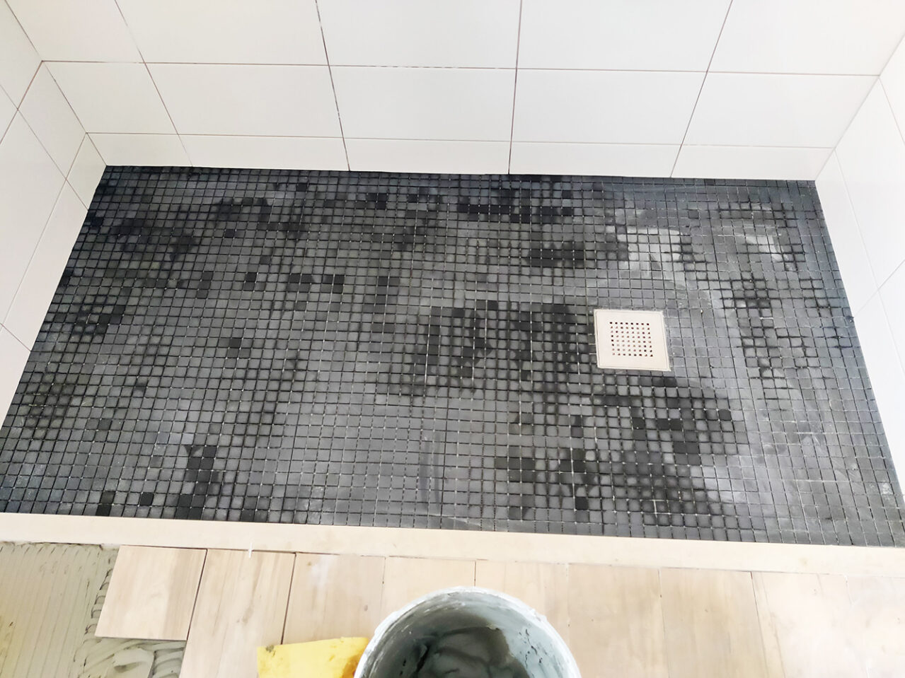 En dit wordt dan de nieuwe douchevloer. Kleine zwarte tegeltjes, die worden geleverd in van die matjes. ’t Legt lekker makkelijk. Complicerende factor is natuurlijk wel het aflopen van de douchevloer naar de afvoer toe en wat het ook lastiger maakte is dat het putje niet lekker uitgemeten was en niet mooi binnen de tegeltjes […]