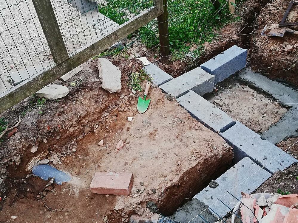 Het fundament zit erin en de eerste laag is bijna gelegd. Een beetje slordig en niet helemaal waterpas, maar dat corrigeren we wel met de volgende lagen. Het is een beetje moeilijk door de afvoerbuis die er dwars doorheen gaat. Dat hebben we maar opgelost door er beton in te storten, wel zo makkelijk en […]