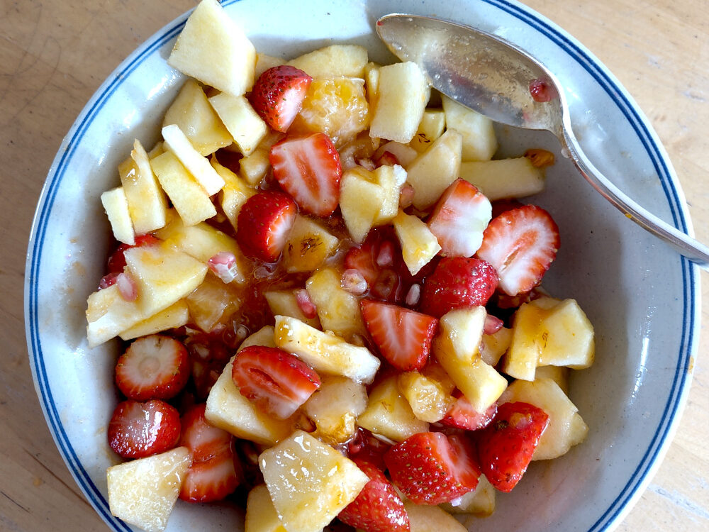 Fruitsalade van eigen bodem. Letterlijk. Appel, peer, mandarijn, granaatappel, aardbei, diospyros. Appel en peer al wat langer van de boom. De rest vers geplukt. Wat een weelde!
