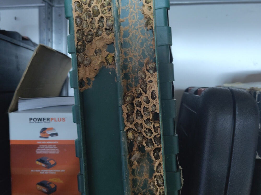 Alweer metselbijen. Die diertjes hebben het maar druk. Onder de koffer van een schroefboormachine hebben ze in korte tijd een hele school aan metselbijlarven gemetseld. Bij het pakken van de koffer zijn er een paar losgelaten en op de grond gevallen. Die gaan het helaas waarschijnlijk niet halen. De rest zit nog gewoon geplakt onder […]