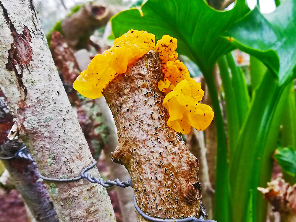 Nergens te zien, op het hele terrein niet, maar op een van de stokken die we hebben gebruikt om een hekje te maken, hangt deze, de Gele Trilzwam. Het leek eerste op een velletje van een mandarijn of zo dat achteloos in de bosjes gegooid was, maar het is toch echt een soort van paddenstoel. […]