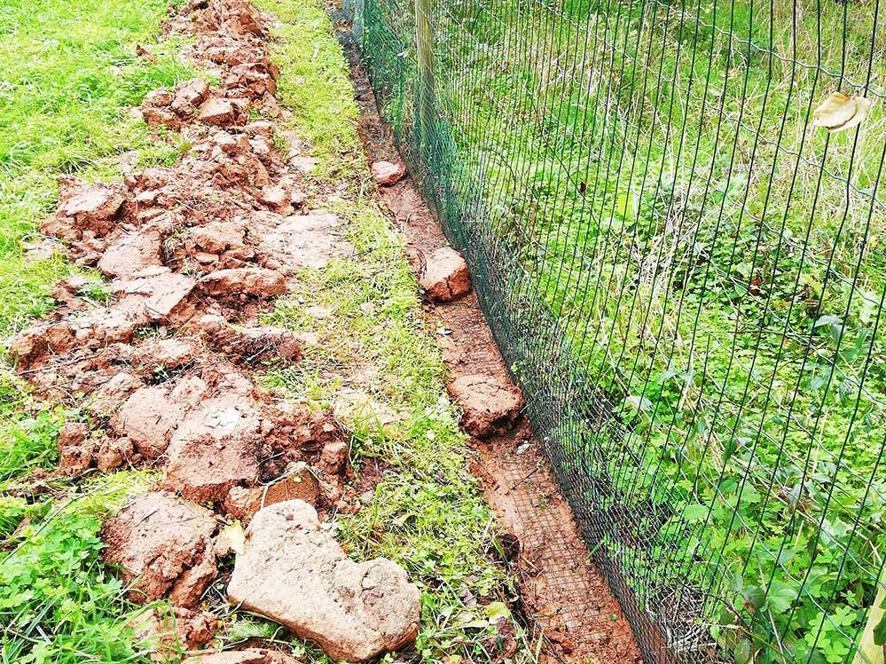 Het werk van Edward was pas half af. We zijn het nu aan het doorzetten, dat wil zeggen we zijn een geul aan het graven graven van pakweg 30 cm diep, vervolgens gaat het gaas erin en daarna weer dicht. Het gaas wordt met kleine stukjes ijzerdraad vastgezet aan het bestaande hek. Eerst deden we […]