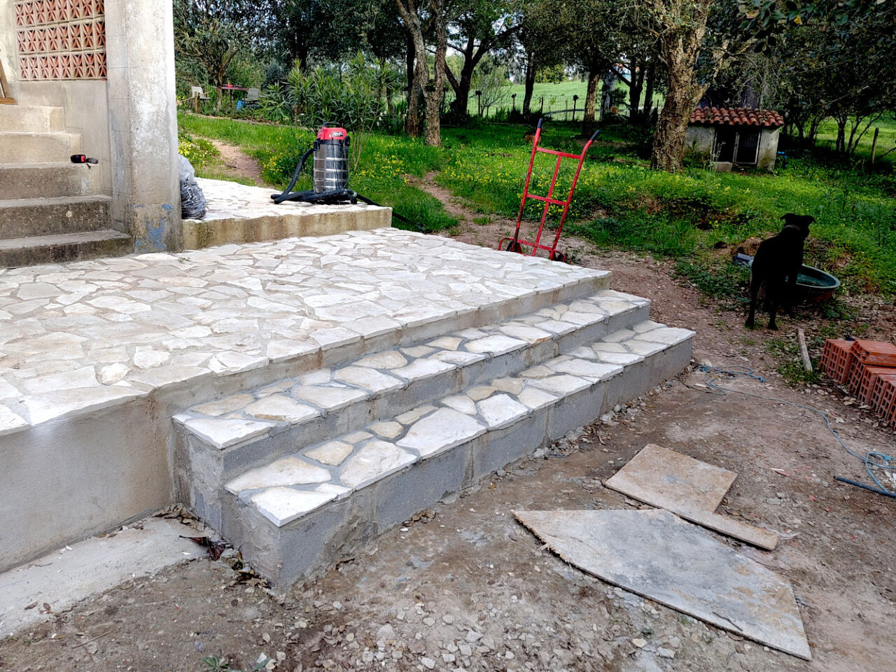 We zijn weer een stapje verder. Deze keer wel zo letterlijk. Leo heeft het afstapje afgemaakt. We kunnen nu van het terras zo de diepte in stappen via een klein trapje, waar het eerst een behoorlijke sprong in het diepe was. Een paar weken geleden was het afstapje al gemaakt en de tegels waren erop […]