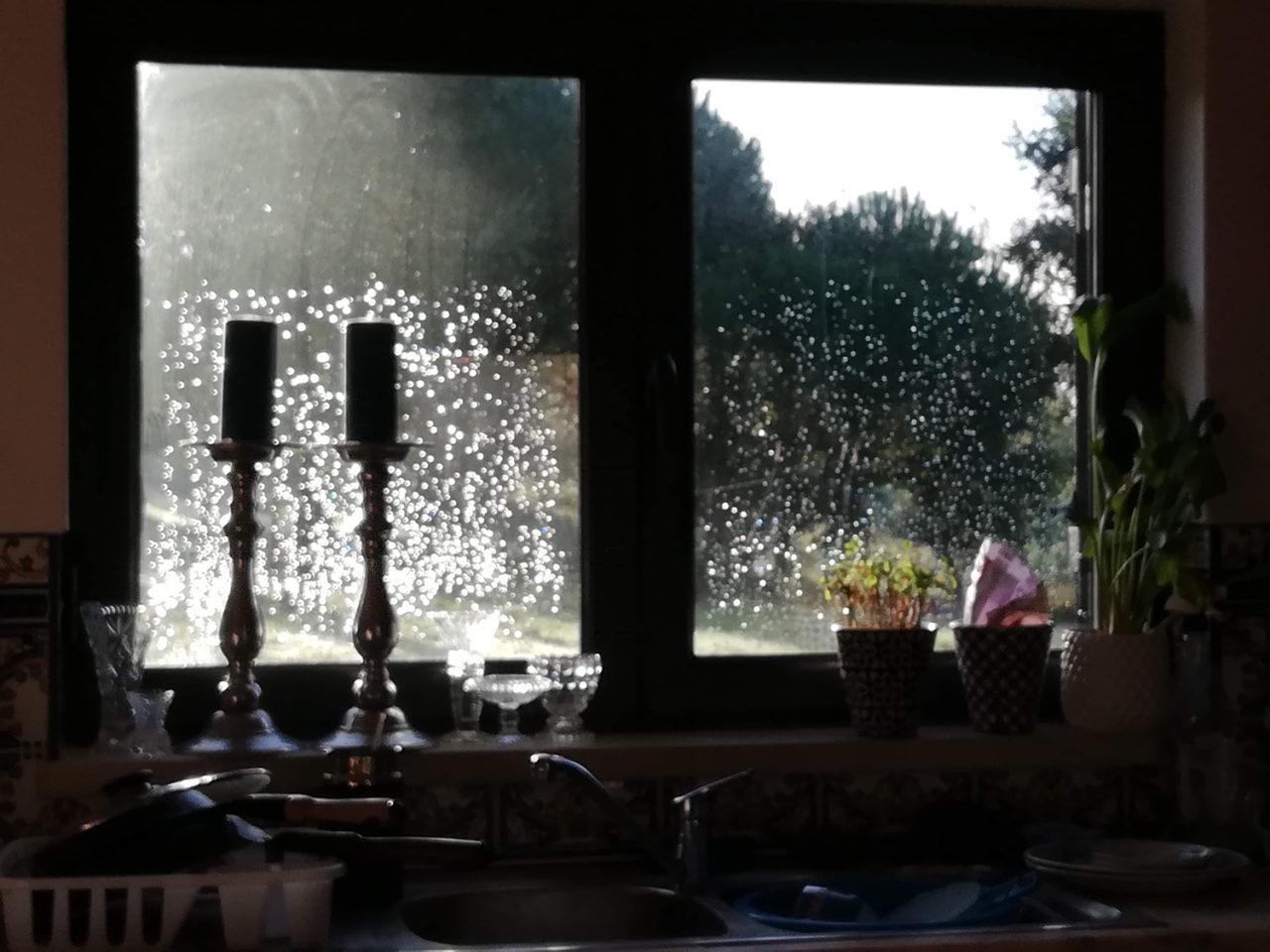 Het heeft flink geregend en als dan de zon doorkomt krijg je mooie tegenlichteffecten. Gisteren hebben we Yvonne opgehaald uit Lissabon. De hele heenweg heeft het gestortregend. Vandaag gaat het een mooie dag worden, lijkt het.