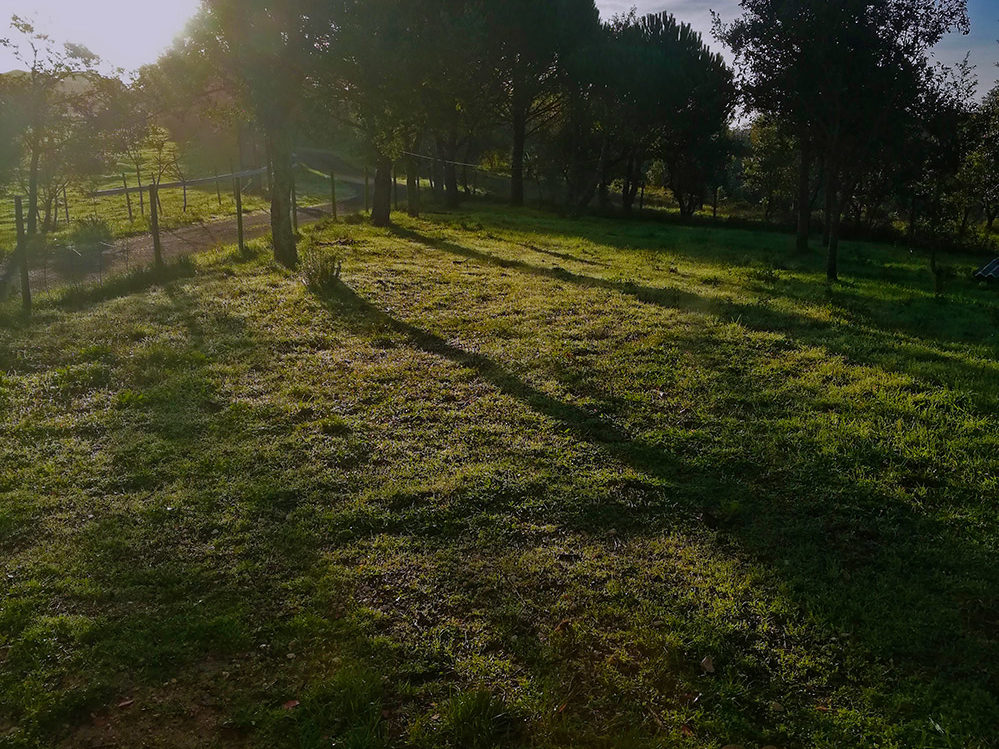 Als de zon net boven de heuvel komt, even voor achten, dan zie je mooie lange schaduwen. Ook al is het begin december, toch heeft de zon al kracht, zo vroeg in de morgen. Het belooft weer een mooie dag te worden. Gewoon in je T-shirt een beetje buiten op het terrein werken. Mooi toch.