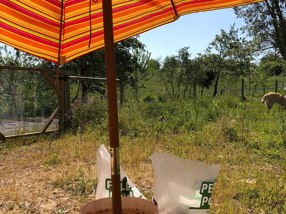 We zijn weer naar huis maar onze gasten blijven nog even. Het is lekker warm geworden dus er moest een parasolstandaard geïmproviseerd worden.