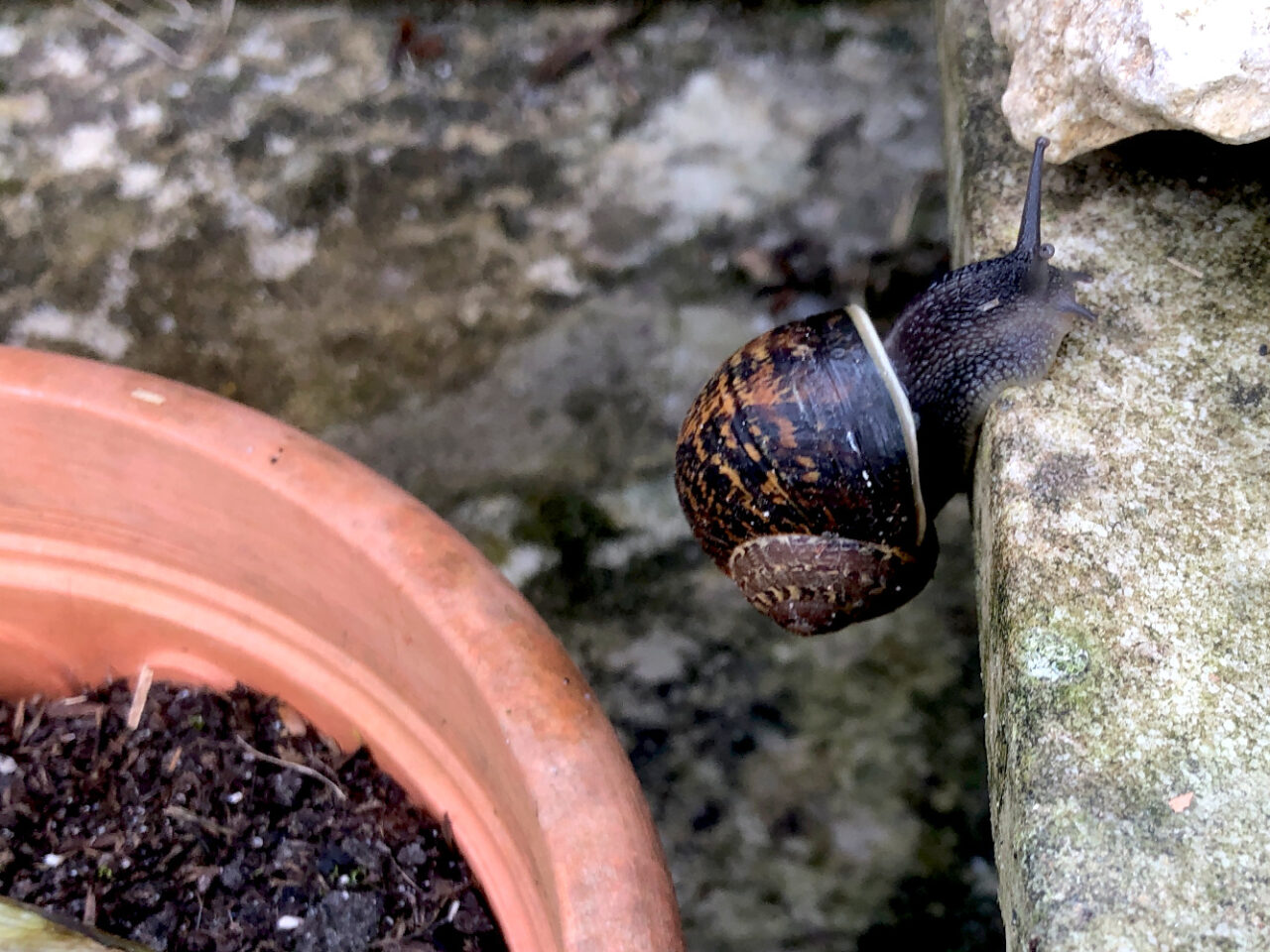 Ai, net te laat. Deze slak is een aardige evenwichtskunstenaar, hij probeerde van de bloempot naar de marmeren plaat ernaast over te steken. De oversteek is anderhalf keer de grootte van het huisje. Hij hoeft moeten reiken en reiken. Op het moment dat we keken was hij met z’n kop al aan de overkant en […]