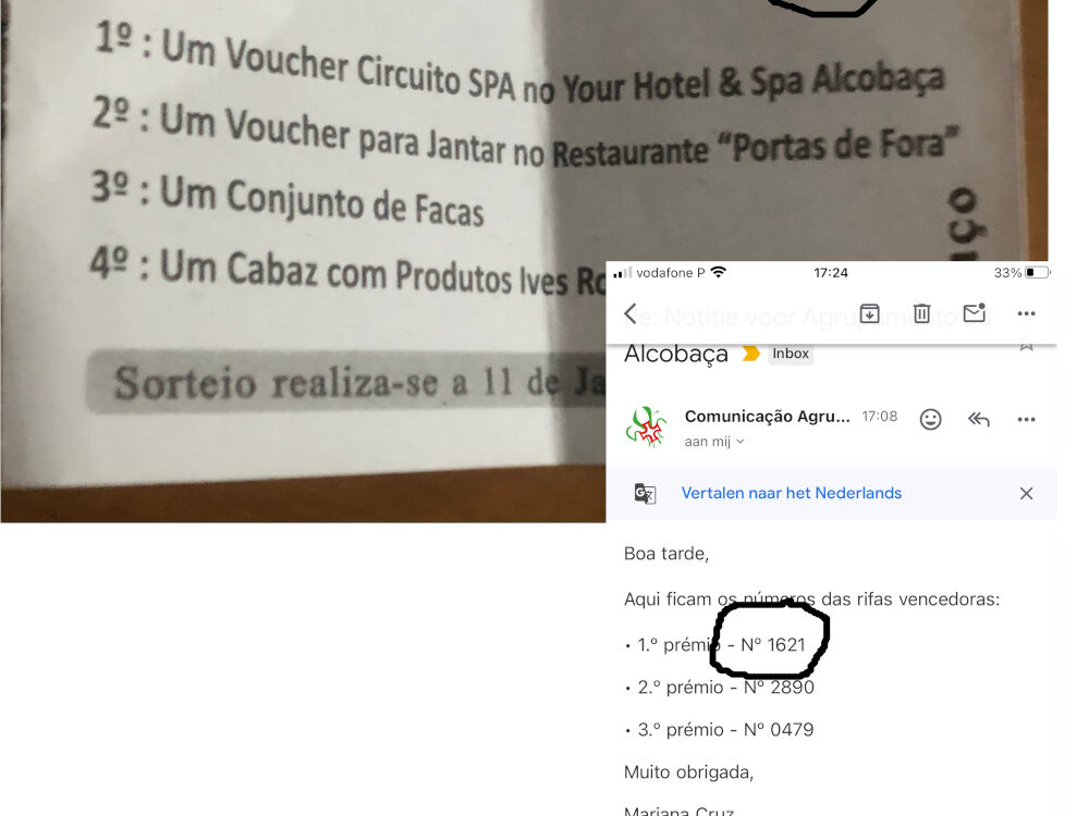 Dat is ook wat. Zit je rustig op een terrasje in Alcobaça, ’t was al in november, komt er een meisje van de locale scouting langs om loten te verkopen. Ach, je steunt er de scouting mee, dus waarom niet. Wel twee loten gekocht en de loten opgeborgen. Vandaag toevallig in de portemonnee gekeken en […]