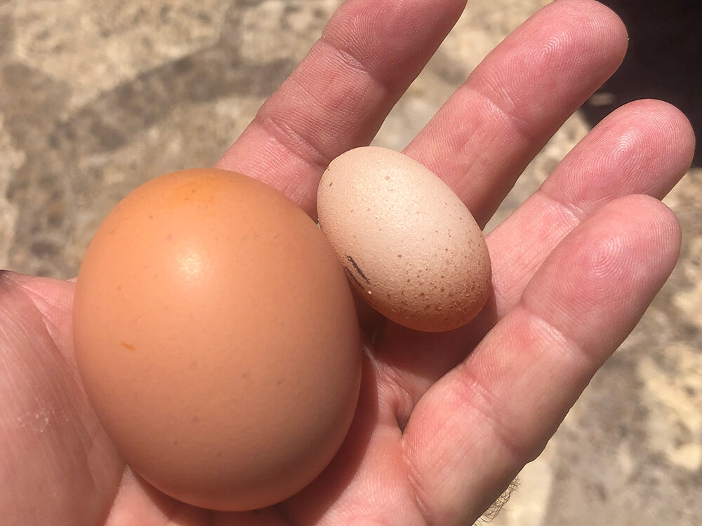 De ene dag vinden we het grootste ei ooit, zie gisteren, en een dag later vinden we het kleinste ei. Het grotere ei op de foto heeft normale afmetingen, het kleine ernaast heeft de maat van een chocolade paasei. ’t Kan zomaar de eerste leg zijn van een van de nieuwelingen, maar het kan ook […]