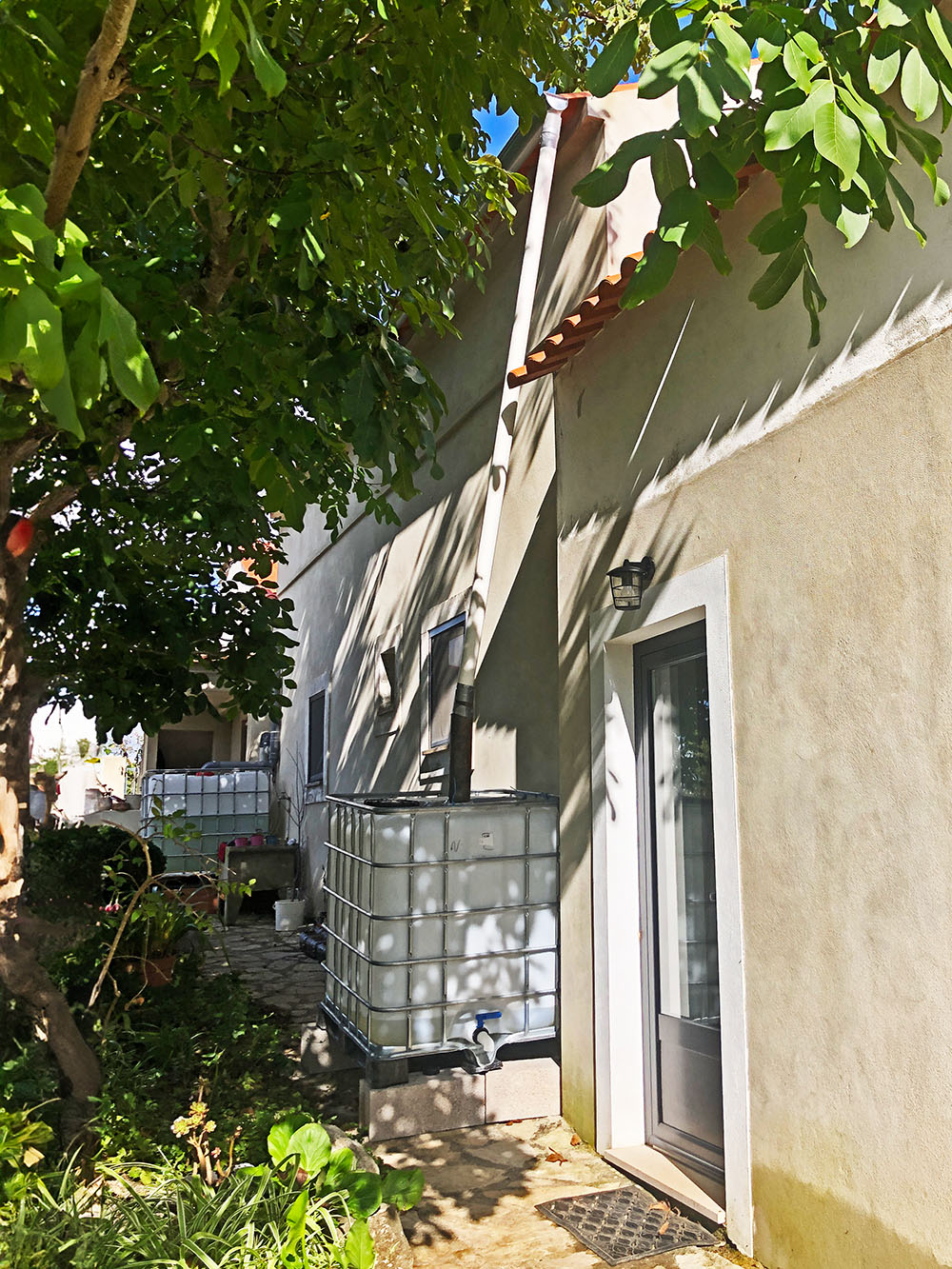 Zoals gezegd, de goten zijn nog niet allemaal aangelegd. De goten van het middelste huis hebben nog geen regenpijp. Als het regent klettert het water zo naar beneden, met een hoop gespetter.